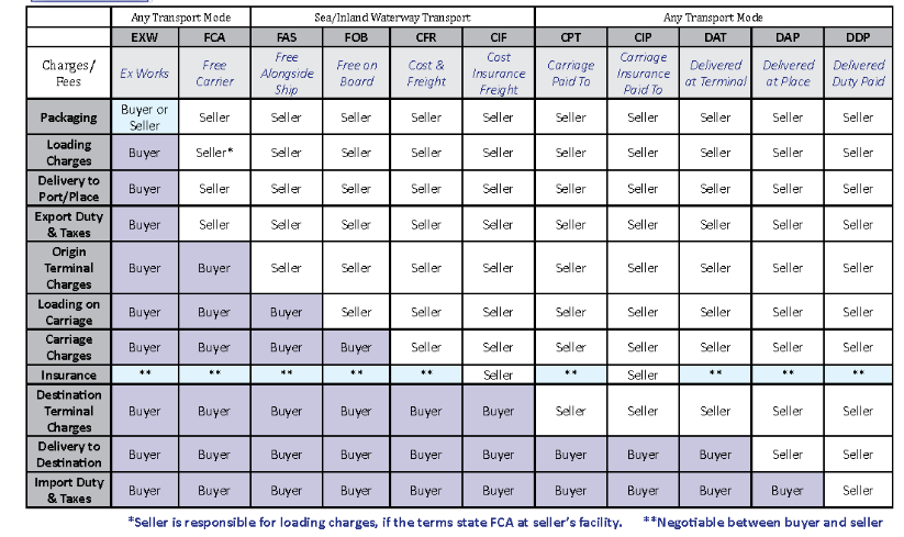 A number of standard conditions of sale have come to be used in International trade. The most popular are the International Commercial Terms or Incoterms, for short. These were decided by the International Chamber of Commerce (ICC). They are used both in writing and negotiating contracts. For example, a seller in Brazil might say they can sell you an amount of coffee FOB Santos for a particular price. As you can see in the table below, this means that for the stated price they will deliver the goods to the port of Santos, load them onto a ship and get permission for them to be exported, but you must pay for the shipping costs and get permission to import them into your country.